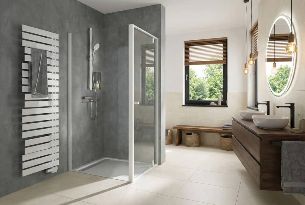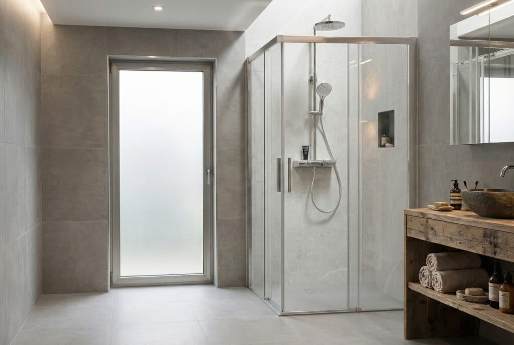 Hierbei verzichten wir im Duschbereich auf klassische Fliesen und nutzen stattdessen großformatige Wandpaneele (z. B. aus Acryl oder Verbundwerkstoff). Der Vorteil: Es gibt keine Fugen, die schimmeln oder verfärben können. Die Flächen sind extrem pflegeleicht und sehen sehr modern aus.